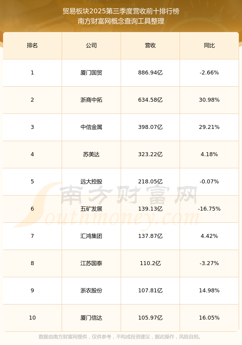 按照南方財(cái)富網(wǎng)概念查詢工具統(tǒng)計(jì),該股所屬板塊為貿(mào)易板塊,該板塊共有36只股票,華錫有色2025第三季度營收在該板塊中排名為第17名,該板塊2025第三季度營收排名前十的股票如下表:
