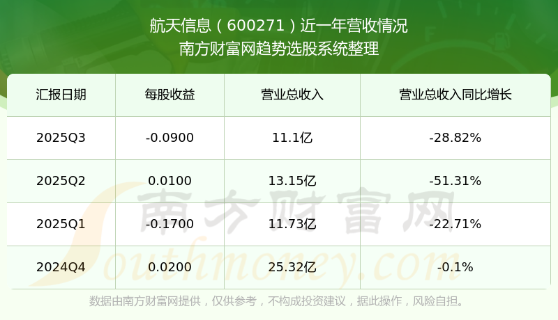 航天信息(600271)披露2025年第三季度報(bào)告,報(bào)告期實(shí)現(xiàn)營(yíng)收11.1億元,同比-28.82%;歸母凈利潤(rùn)-1.56億元,同比-402.09%;扣非凈利潤(rùn)-1.97億元,同比-18.57%。