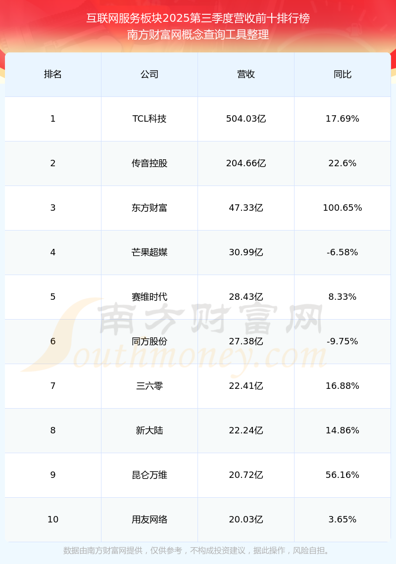 按照南方財(cái)富網(wǎng)概念查詢工具統(tǒng)計(jì),該股所屬板塊為互聯(lián)網(wǎng)服務(wù)板塊,該板塊共有51只股票,航天信息2025第三季度營(yíng)收在該板塊中排名為第51名,該板塊2025第三季度營(yíng)收排名前十的股票如下表: