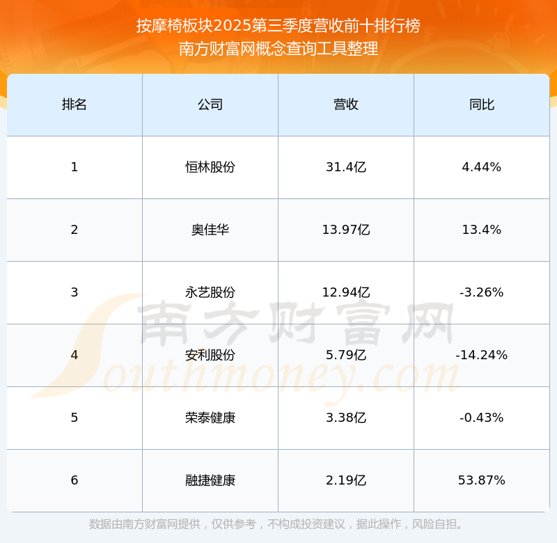 按照南方財(cái)富網(wǎng)概念查詢工具統(tǒng)計(jì),該股所屬板塊為按摩椅板塊,該板塊共有6只股票,榮泰健康2025第三季度營(yíng)收在該板塊中排名為第5名,該板塊2025第三季度營(yíng)收排名前十的股票如下表: