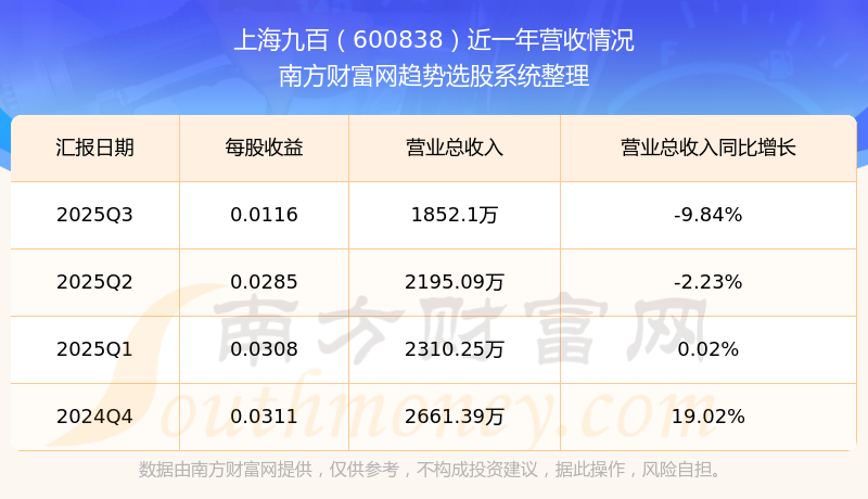 按照南方財(cái)富網(wǎng)概念查詢工具統(tǒng)計(jì),該股所屬板塊為商業(yè)百貨板塊,該板塊共有74只股票,上海九百2025第三季度營收在該板塊中排名為第74名,該板塊2025第三季度營收排名前十的股票如下表: