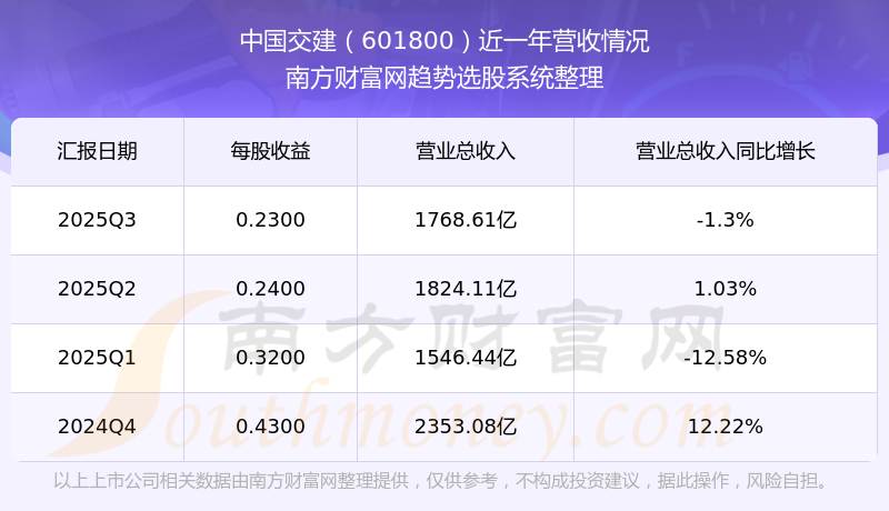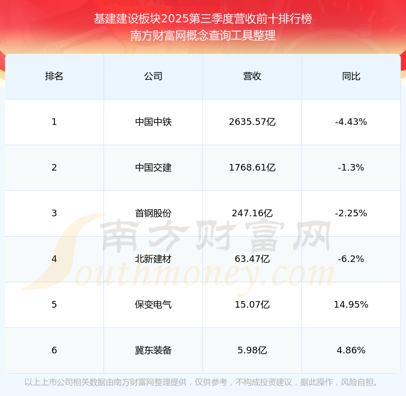 按照南方財富網(wǎng)概念查詢工具統(tǒng)計,該股所屬板塊為基建建設板塊,該板塊共有6只股票,中國交建2025第三季度營收在該板塊中排名為第2名,該板塊2025第三季度營收排名前十的股票如下表: