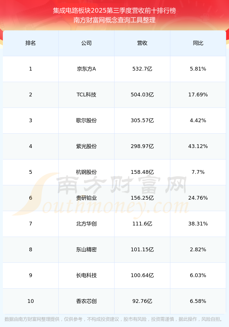 按照南方財富網(wǎng)概念查詢工具統(tǒng)計,該股所屬板塊為集成電路板塊,該板塊共有192只股票,電科芯片2025第三季度營收在該板塊中排名為第192名,該板塊2025第三季度營收排名前十的股票如下表: