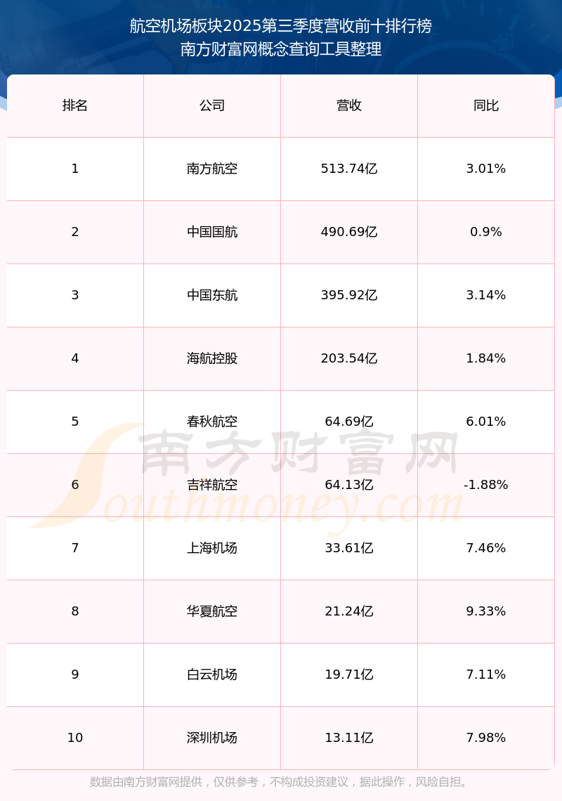 按照南方財(cái)富網(wǎng)概念查詢工具統(tǒng)計(jì),該股所屬板塊為航空機(jī)場(chǎng)板塊,該板塊共有14只股票,上海機(jī)場(chǎng)2025第三季度營(yíng)收在該板塊中排名為第7名,該板塊2025第三季度營(yíng)收排名前十的股票如下表: