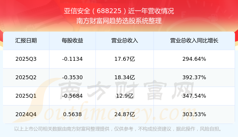 在2025年第三季度,亞信安全的業(yè)績(jī)表現(xiàn),主營業(yè)務(wù)收入達(dá)到17.67億元,實(shí)現(xiàn)了294.64%的同比增長率。同時(shí),公司歸母凈利潤錄得-4383.37萬元,同比增長-170.05%。