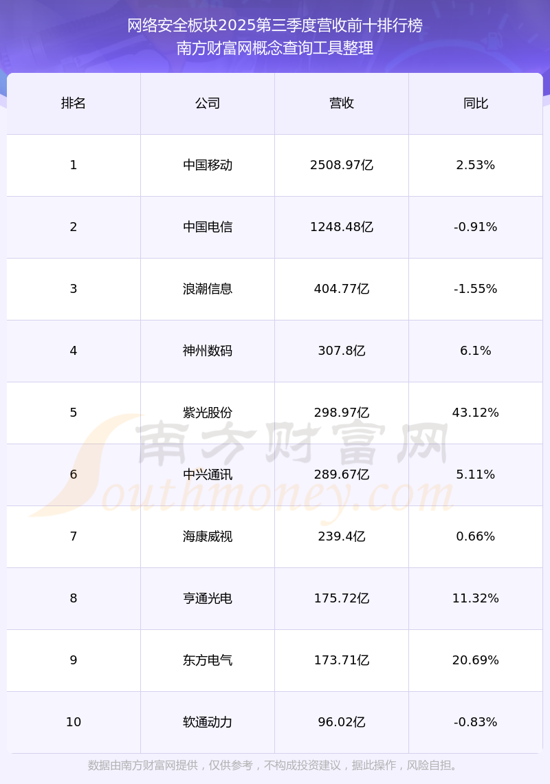 按照南方財(cái)富網(wǎng)概念查詢工具統(tǒng)計(jì),該股所屬板塊為網(wǎng)絡(luò)安全板塊,該板塊共有180只股票,亞信安全2025第三季度營收在該板塊中排名為第29名,該板塊2025第三季度營收排名前十的股票如下表: