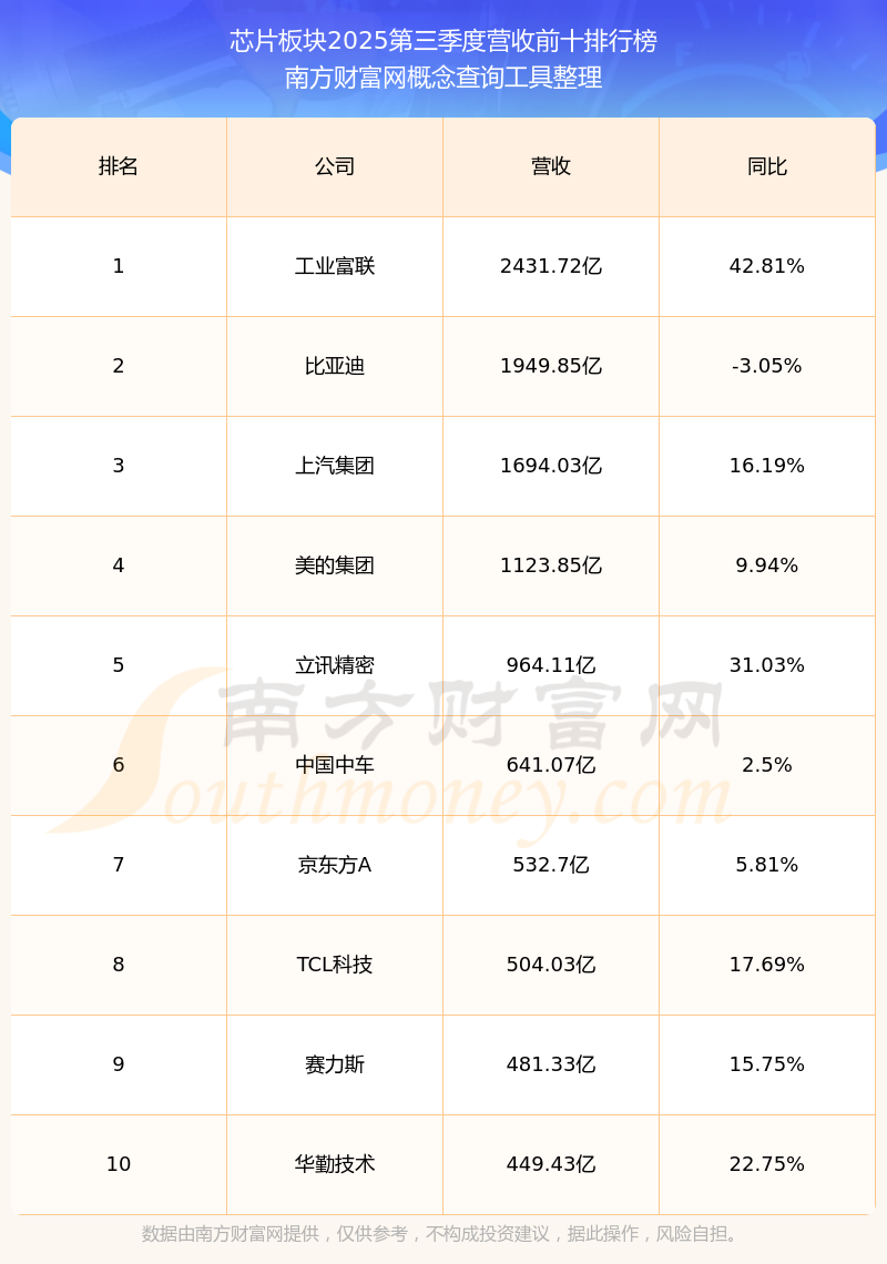 按照南方財富網(wǎng)概念查詢工具統(tǒng)計,該股所屬板塊為芯片板塊,該板塊共有900只股票,泰凌微2025第三季度營收在該板塊中排名為第597名,該板塊2025第三季度營收排名前十的股票如下表: