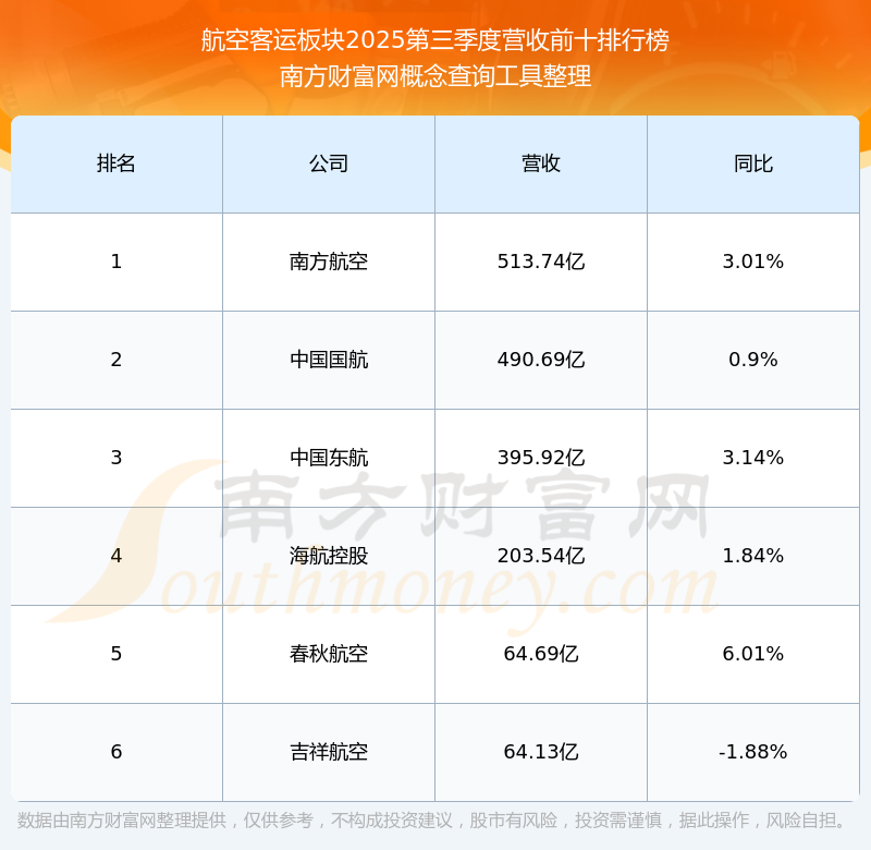 按照南方財(cái)富網(wǎng)概念查詢(xún)工具統(tǒng)計(jì),該股所屬板塊為航空客運(yùn)板塊,該板塊共有6只股票,中國(guó)國(guó)航2025第三季度營(yíng)收在該板塊中排名為第2名,該板塊2025第三季度營(yíng)收排名前十的股票如下表: