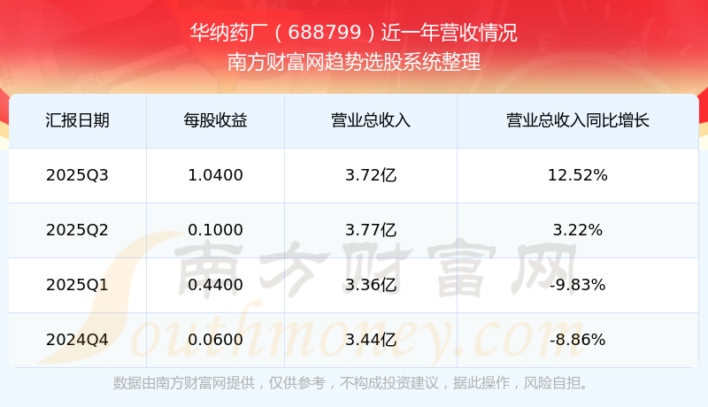 華納藥廠2025年第三季度顯示,公司主營收入3.72億元,同比12.52%;歸母凈利潤1.36億元,同比198.16%;扣非凈利潤3968.77萬元,同比-2.09%;
