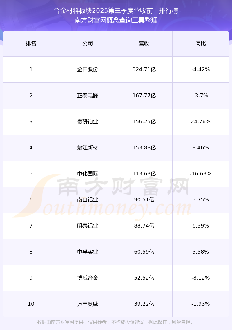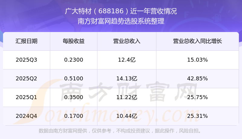 按照南方財(cái)富網(wǎng)概念查詢工具統(tǒng)計(jì),該股所屬板塊為合金材料板塊,該板塊共有53只股票,廣大特材2025第三季度營收在該板塊中排名為第25名,該板塊2025第三季度營收排名前十的股票如下表: