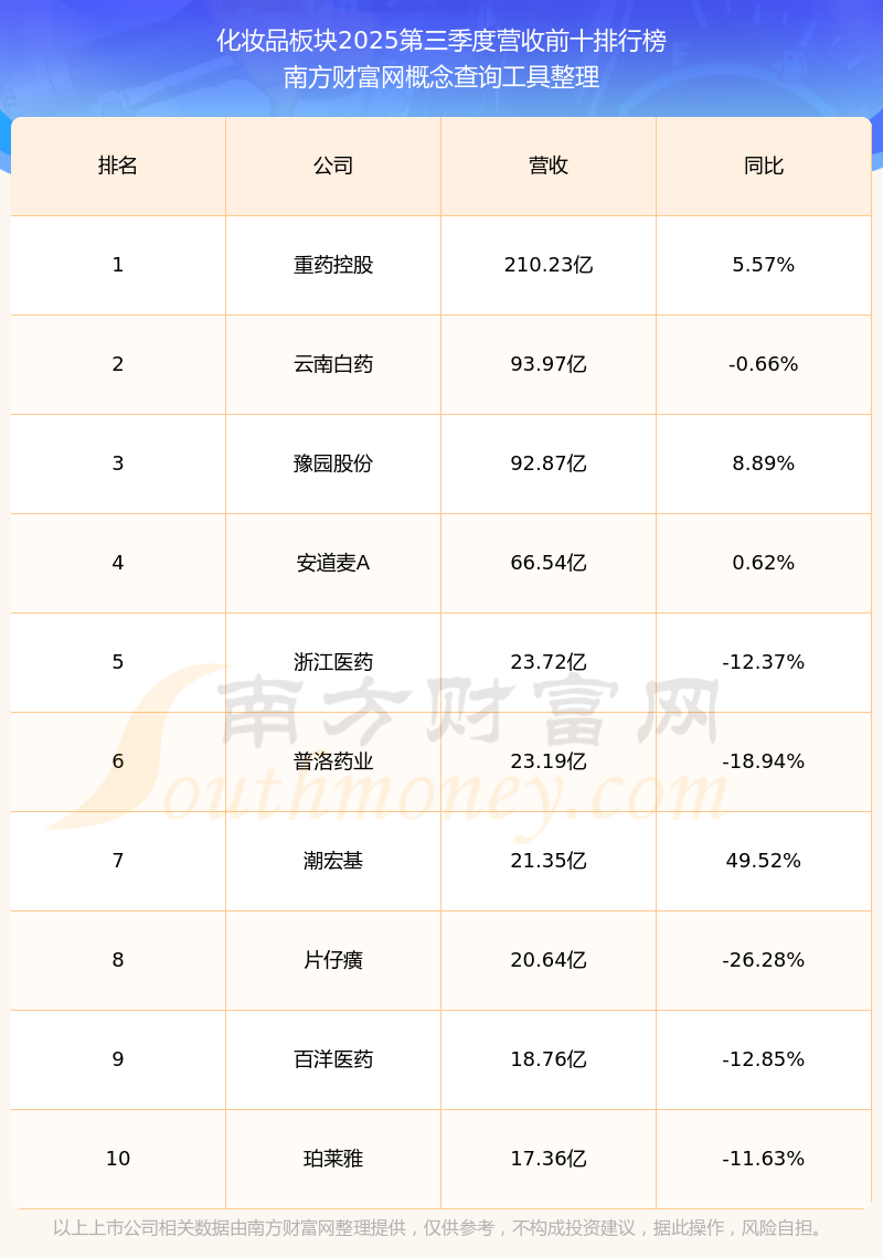 按照南方財富網(wǎng)概念查詢工具統(tǒng)計,該股所屬板塊為化妝品板塊,該板塊共有75只股票,珀萊雅2025第三季度營收在該板塊中排名為第10名,該板塊2025第三季度營收排名前十的股票如下表: