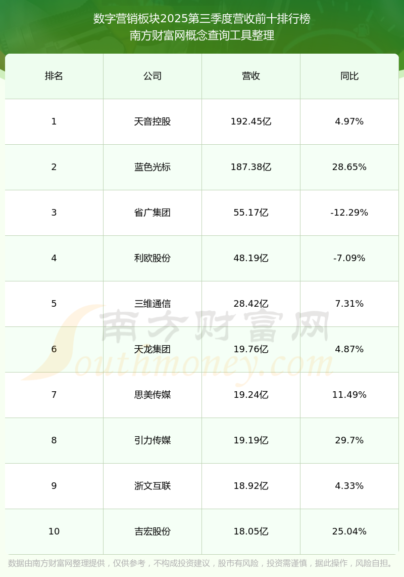 按照南方財富網(wǎng)概念查詢工具統(tǒng)計,該股所屬板塊為數(shù)字營銷板塊,該板塊共有65只股票,引力傳媒2025第三季度營收在該板塊中排名為第8名,該板塊2025第三季度營收排名前十的股票如下表: