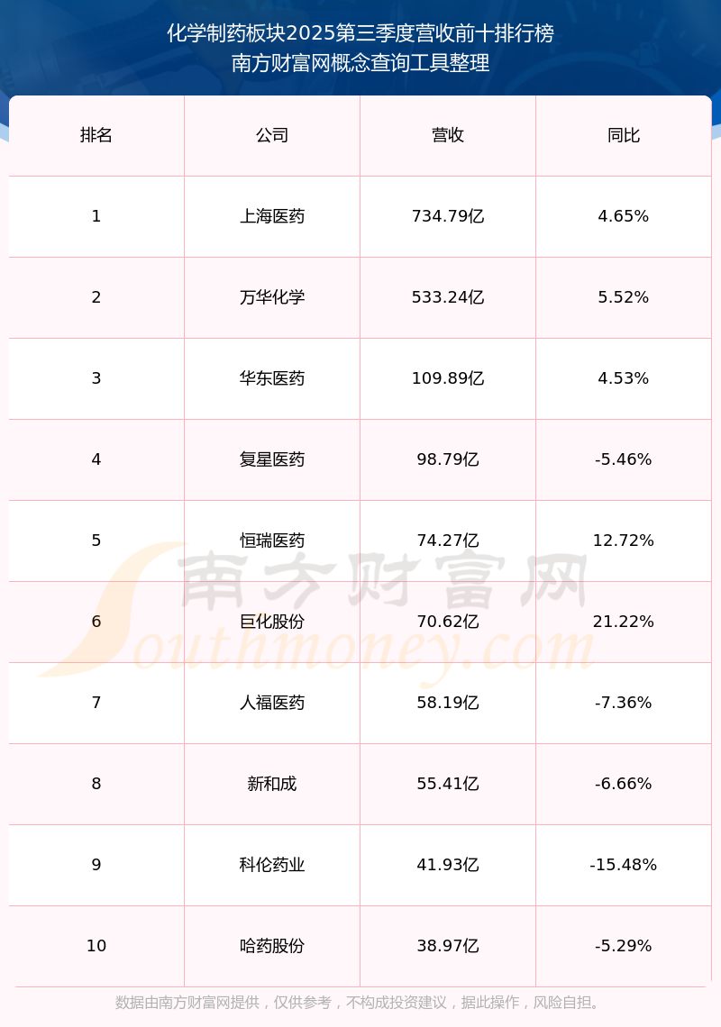 按照南方財(cái)富網(wǎng)概念查詢工具統(tǒng)計(jì),該股所屬板塊為化學(xué)制藥板塊,該板塊共有175只股票,司太立2025第三季度營(yíng)收在該板塊中排名為第73名,該板塊2025第三季度營(yíng)收排名前十的股票如下表: