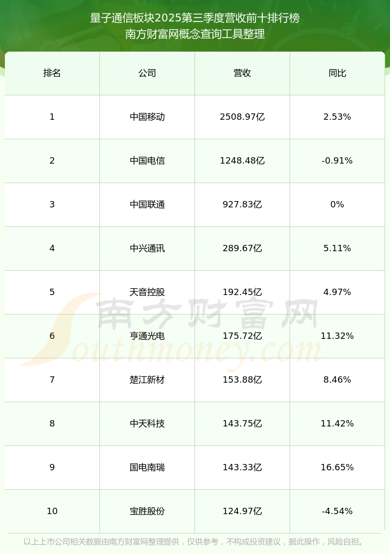 按照南方財(cái)富網(wǎng)概念查詢工具統(tǒng)計(jì),該股所屬板塊為量子通信板塊,該板塊共有83只股票,國(guó)盾量子2025第三季度營(yíng)收在該板塊中排名為第75名,該板塊2025第三季度營(yíng)收排名前十的股票如下表: