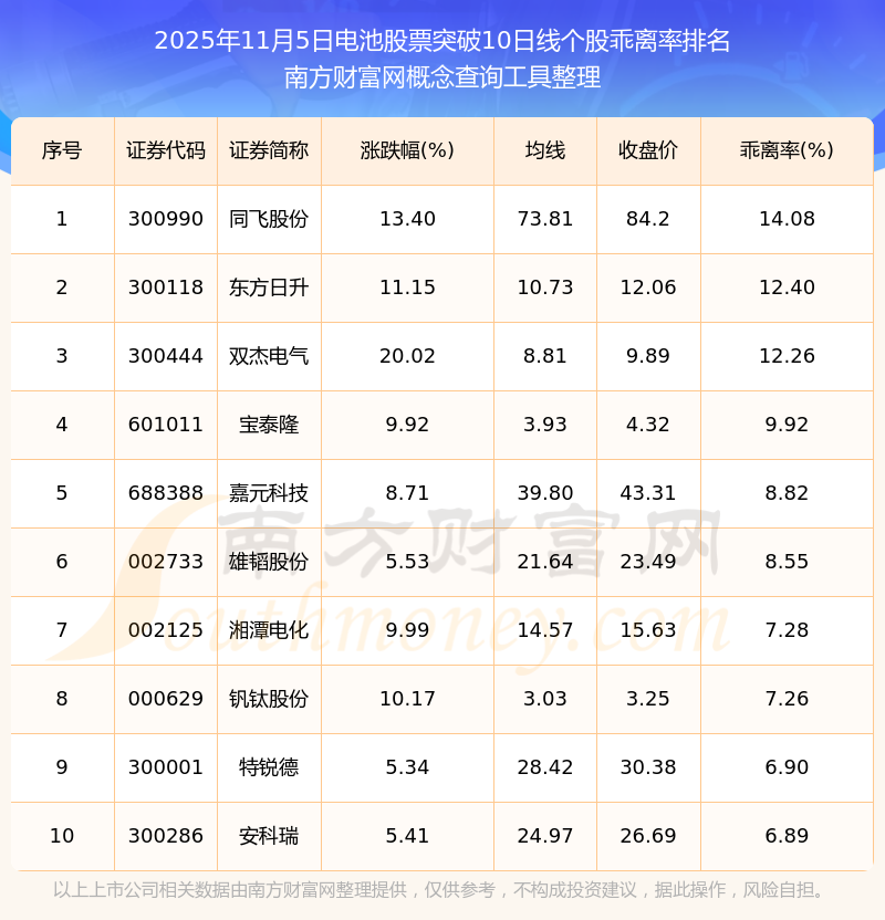 根據(jù)南方財富網(wǎng)概念查詢工具數(shù)據(jù)統(tǒng)計,截止2025年11月5日收盤,電池股票共有93只個股收盤價向上突破了10日線。其中乖離率較大的個股有同飛股份、東方日升、雙杰電氣等,乖離率分別為14.08%、12.40%、12.26%。