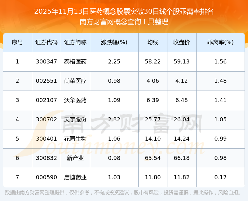 2025年11月13日醫(yī)藥概念股票突破30日線個股乖離率排名