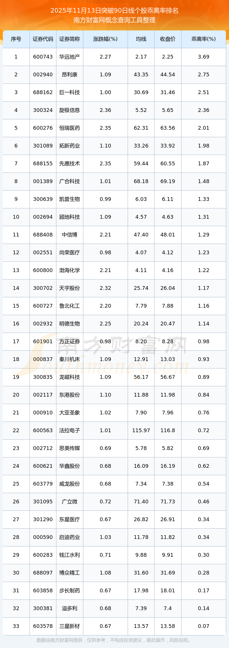 根據(jù)南方財(cái)富網(wǎng)概念查詢工具數(shù)據(jù)統(tǒng)計(jì),截止2025年11月13日收盤,共有33只個股收盤價向上突破了90日線,其中乖離率較大的個股有華遠(yuǎn)地產(chǎn)、昂利康、巨一科技、旋極信息、恒瑞醫(yī)藥等,乖離率分別為3.69%、2.75%、2.51%、2.36%、2.01%。