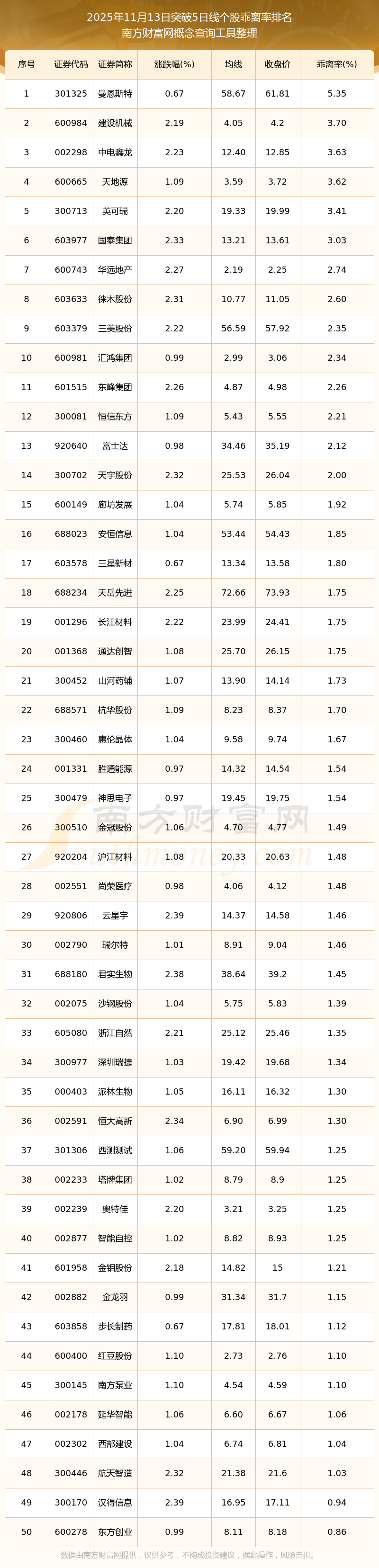 2025年11月13日突破5日線個股乖離率排名