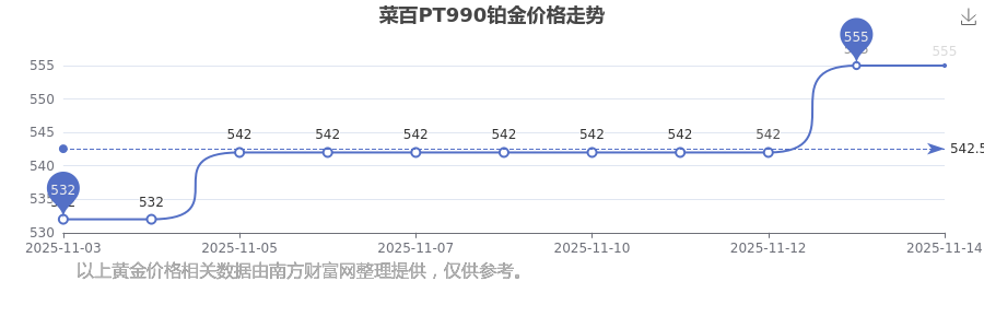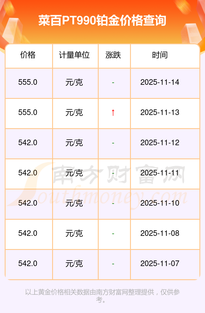 菜百今日 PT990鉑金的最新市場行情價為555.0元/克。