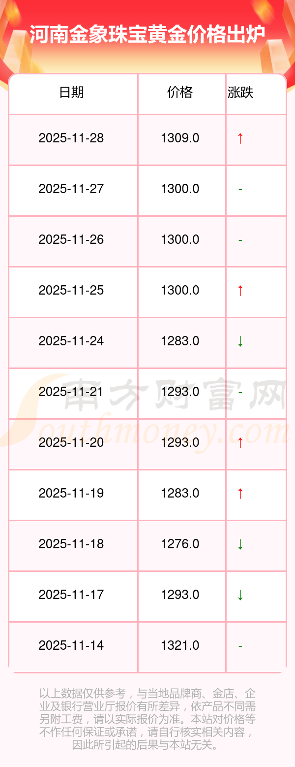 今日河南金象珠寶黃金價格為1309.0元/克。