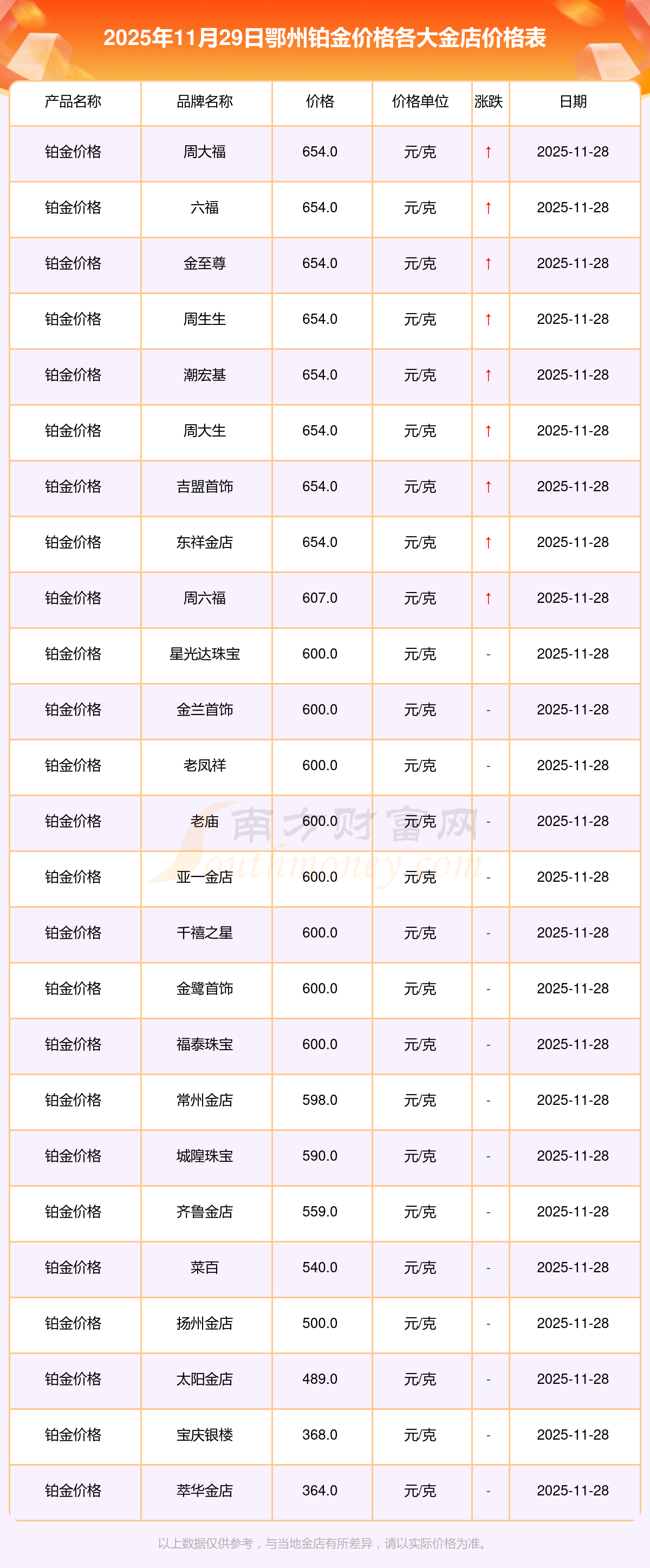 今日鄂州鉑金價格報價最高的金店是周大福,為654.0元/克,報價最低的金店是萃華金店,為364.0元/克。今日鉑金價格高低差為290元/克。