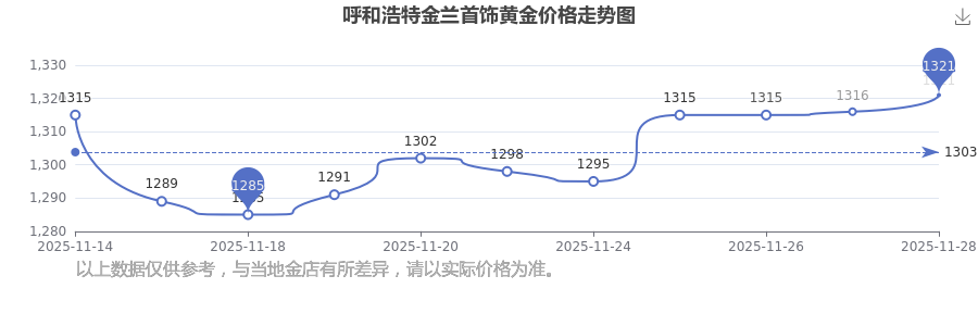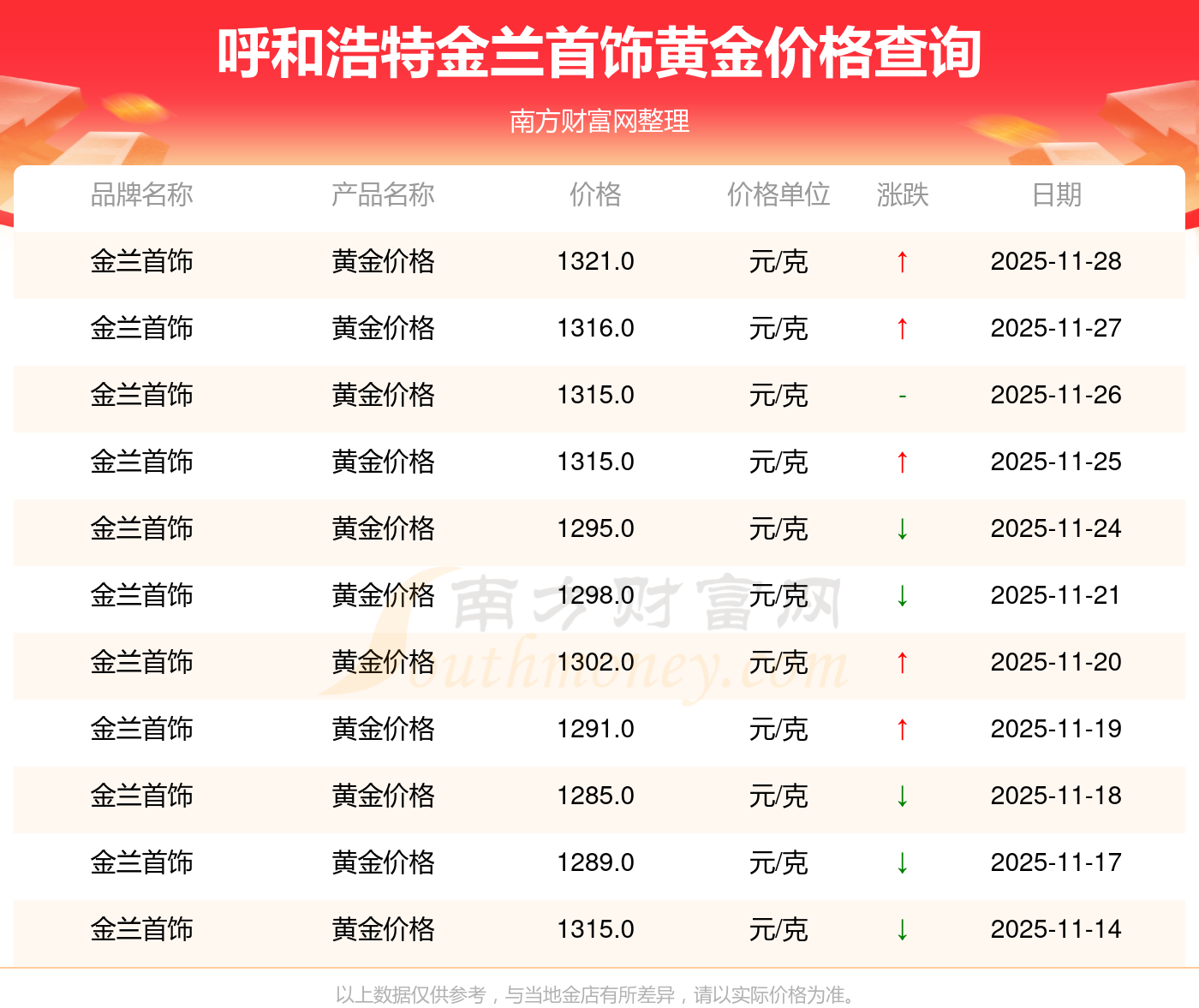 今日呼和浩特金蘭首飾黃金價格最新為:1321.0元/克。