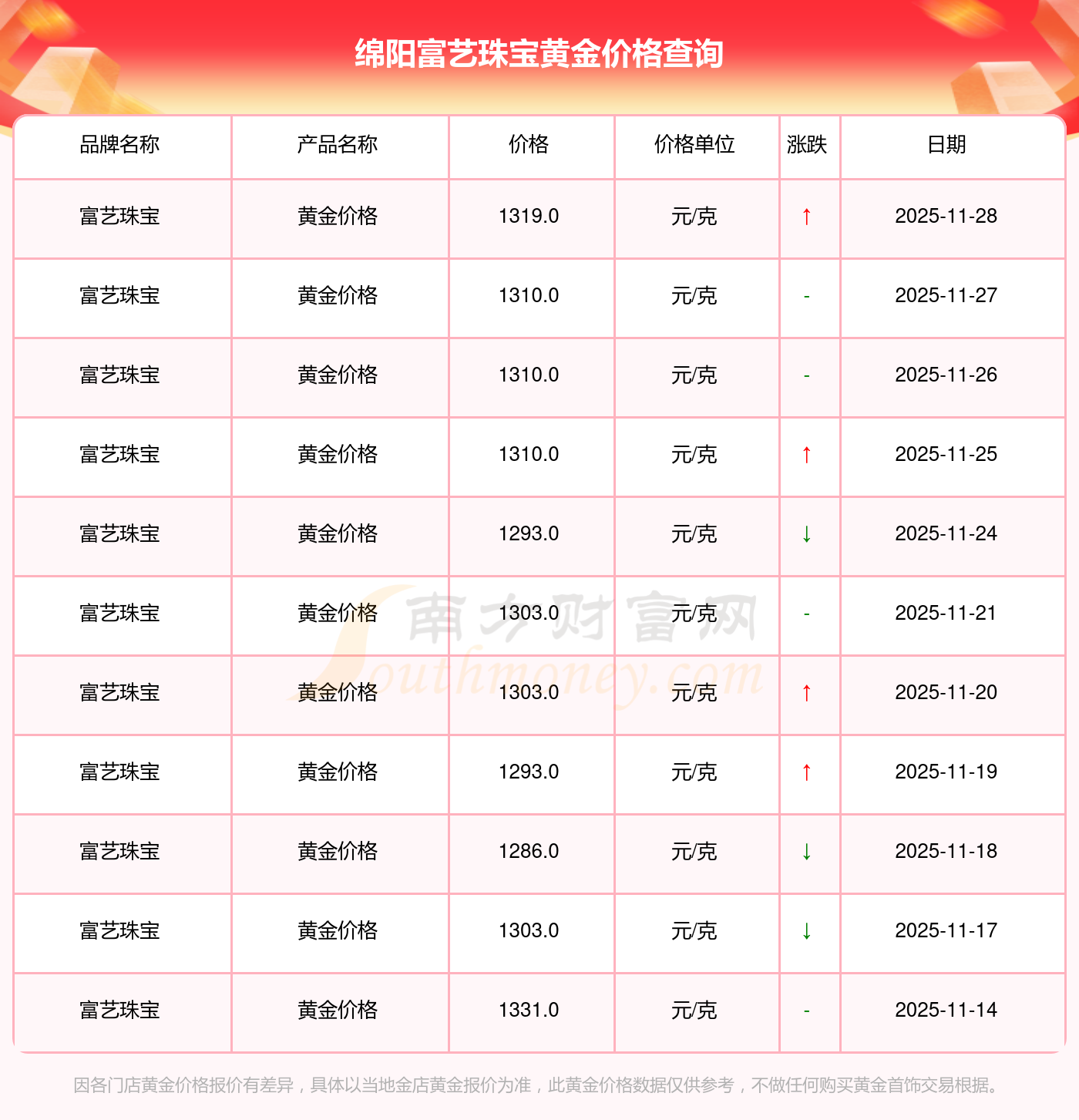 今日(2025年11月29日)綿陽富藝珠寶黃金價格:1319.0元/克。