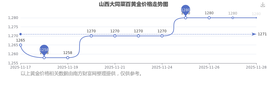 2025年11月30日這一天,山西大同菜百的黃金價格以 1280.0元/克的價格售賣。