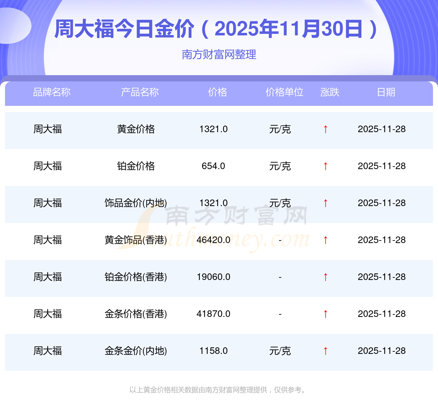 2025年11月30日周大福最新價(jià)格:黃金價(jià)格1321.0元/克,鉑金價(jià)格600.0元/克,銀條價(jià)格12.6元/克,黃金價(jià)格1321.0元/克,鉑金價(jià)格600.0元/克,金條價(jià)格(內(nèi)地)1207.0元/克,金飾價(jià)格(內(nèi)地)1321.0元/克,黃金飾品(香港)46370.0,鉑金飾品(香港)13970.0,金條金價(jià)(香港)41860.0,投資金條1296.0元/克。