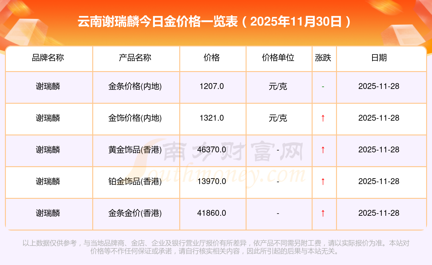 2025年11月30日云南謝瑞麟黃金按克計價,現在多少錢一克?黃金價格1321.0元/克,鉑金價格600.0元/克,銀條價格12.6元/克,黃金價格1321.0元/克,鉑金價格600.0元/克,金條價格(內地)1207.0元/克,金飾價格(內地)1321.0元/克,黃金飾品(香港)46370.0,鉑金飾品(香港)13970.0,金條金價(香港)41860.0,投資金條1296.0元/克。