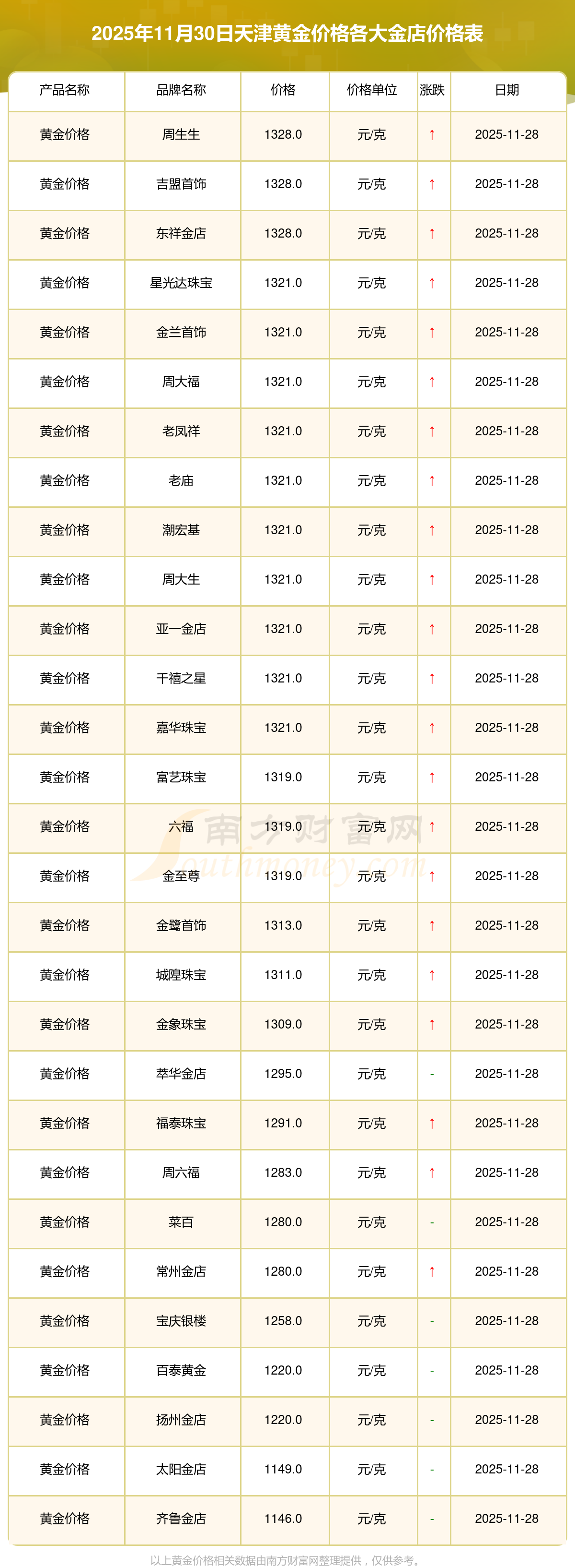 2025年11月30日,天津星光達珠寶、星光達珠寶、寶泉錢幣、金蘭首飾、金蘭首飾、謝瑞麟、謝瑞麟、謝瑞麟、謝瑞麟、謝瑞麟、金銀街等各大金店品牌黃金價格今日價格如下:星光達珠寶1321.0元/克、星光達珠寶600.0元/克、寶泉錢幣12.6元/克、金蘭首飾1321.0元/克、金蘭首飾600.0元/克、謝瑞麟1207.0元/克、謝瑞麟1321.0元/克、謝瑞麟46370.0、謝瑞麟13970.0、謝瑞麟41860.0、金銀街1296.0元/克。