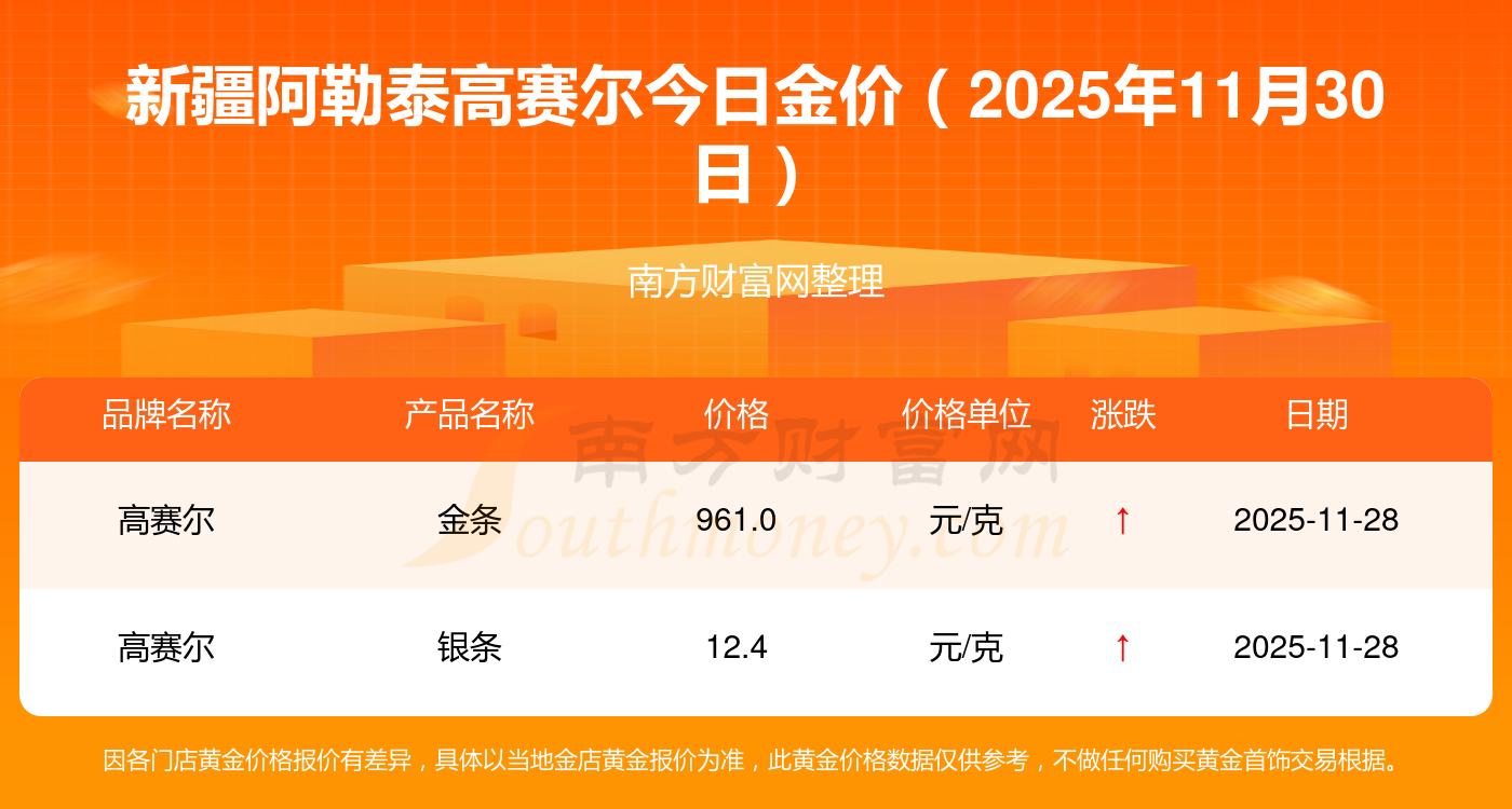 新疆阿勒泰高賽爾金價查詢 新疆阿勒泰高賽爾黃金價格今天多少錢1克?2025年11月30日