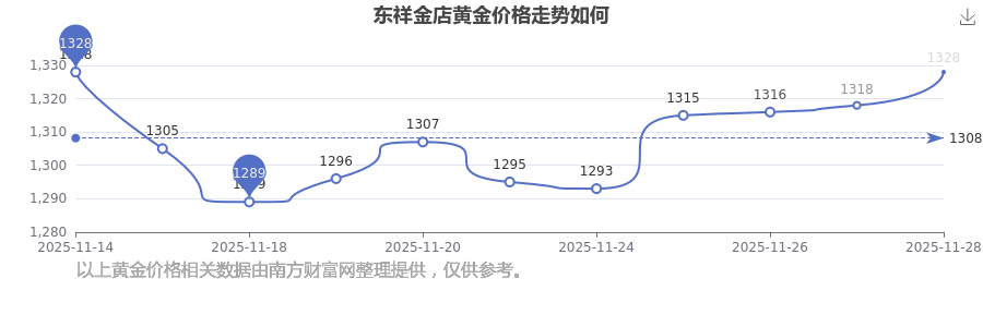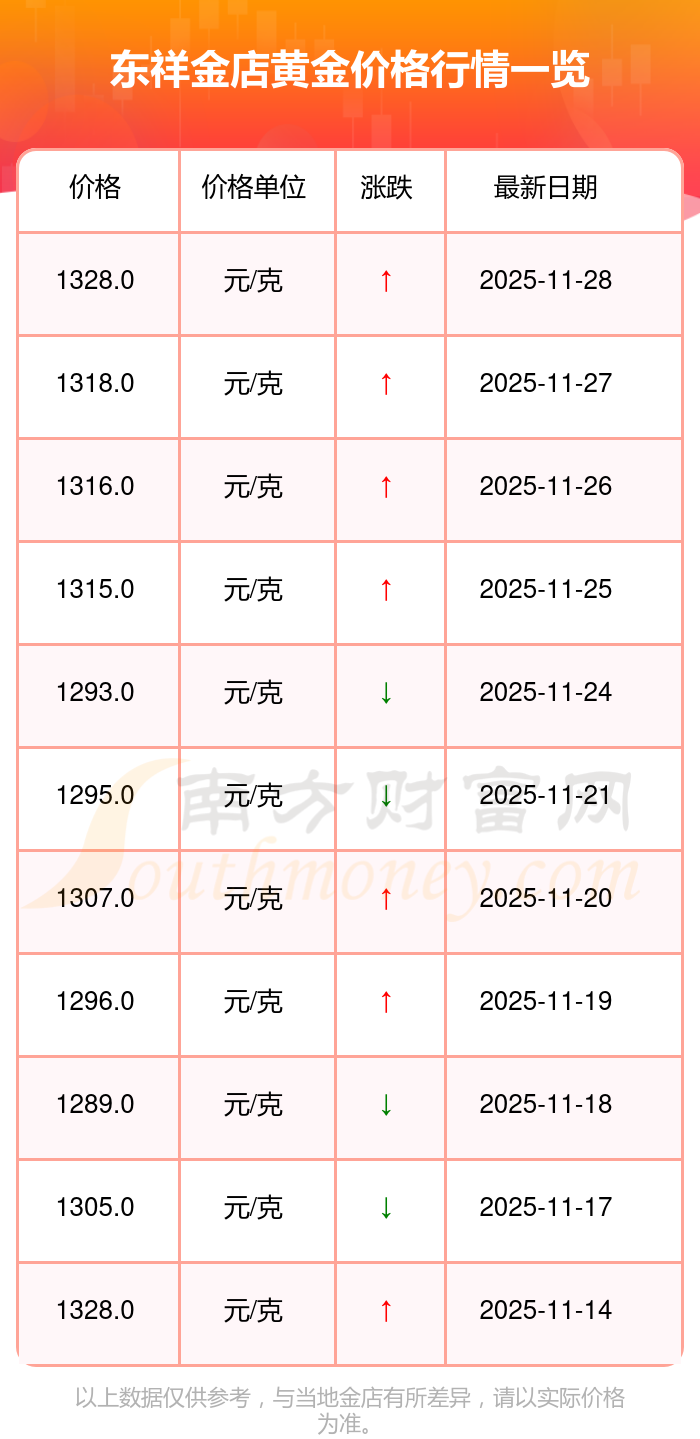 今日(2025年11月30日)東祥金店黃金價格是1328.0元/克。
