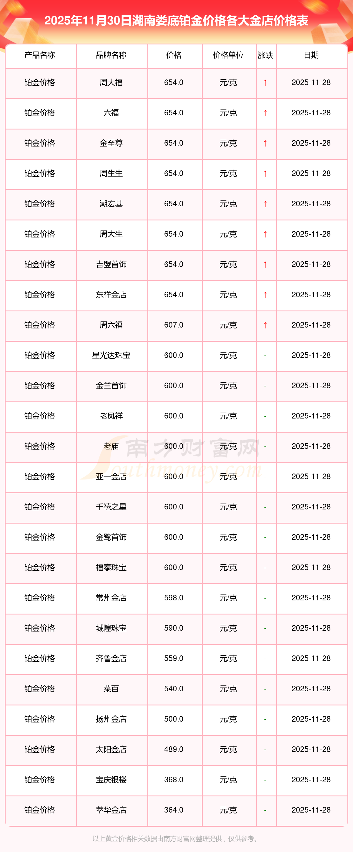 2025年11月30日湖南婁底各金店鉑金價格表來了