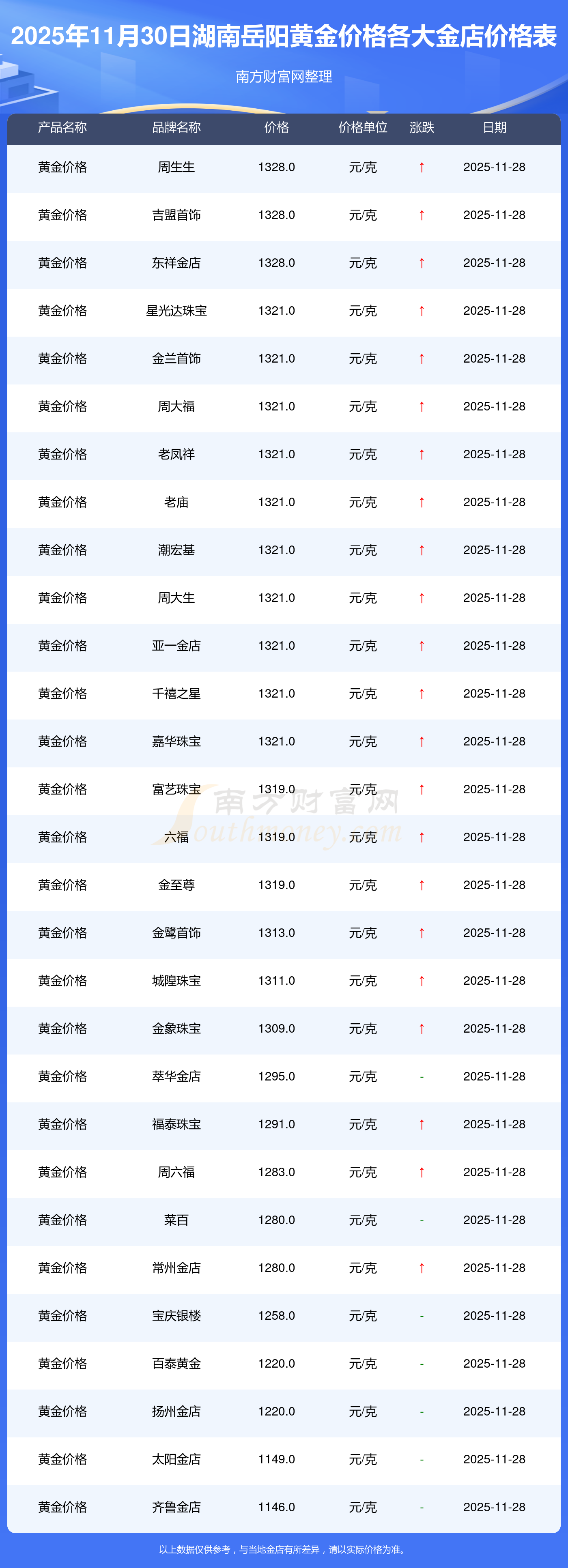 今日湖南岳陽各金店黃金價格一克賣多少錢,湖南岳陽各金店黃金價格今日價格表 2025年11月30日