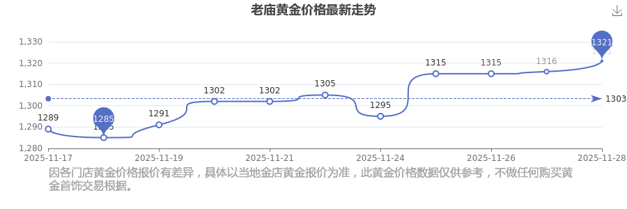 1321.0元/克成為老廟今日 黃金價(jià)格的最新交易的價(jià)格。