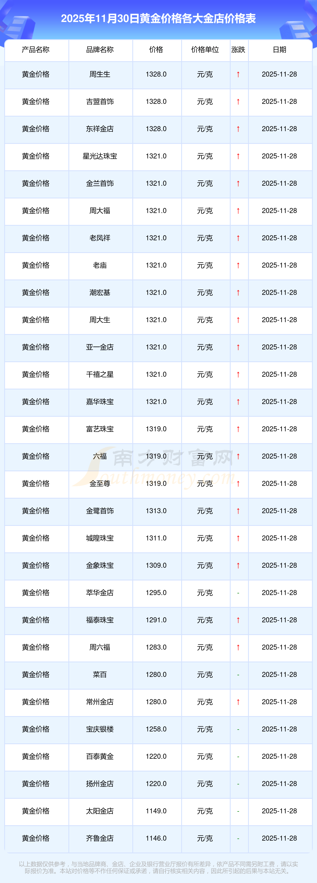 2025年11月30日各大金店黃金價(jià)格最新價(jià)格:星光達(dá)珠寶1321.0元/克,星光達(dá)珠寶600.0元/克,寶泉錢幣12.6元/克,金蘭首飾1321.0元/克,金蘭首飾600.0元/克,謝瑞麟1207.0元/克,謝瑞麟1321.0元/克,謝瑞麟46370.0,謝瑞麟13970.0,謝瑞麟41860.0,金銀街1296.0元/克。