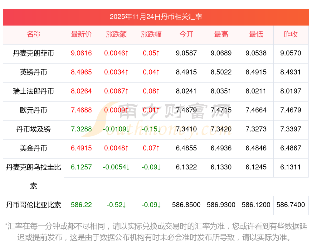 根據(jù)今天2025年11月24日匯率計(jì)算,DKK兌換USD匯率最新價(jià)0.154100,今開價(jià)0.1542,昨收價(jià)0.1542,最高價(jià)0.1542,最低價(jià)0.1540。